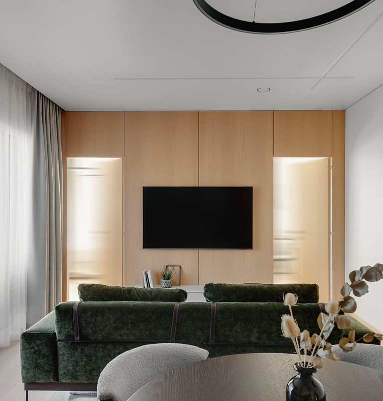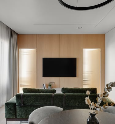 Modernaus stiliaus butas kuriame vyrauja šiluma ir estetika. Labai džiaugiamės turėjusios galimybę šiame projekte įrengti ir balkono zoną, kuri vizualiai prapletė svetainės erdvę. Taip pat daug dėmesio skyrėme TV zonai, kurią dekoravome medžio lukštu, taip įnešdamos daugiau natūralumo bei jaukumo 🤍